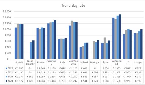 - La tarifa media diaria europea aumentó en 2024. (+50€), situándose en 999€. Hay una amplia gama de tarifas diarias, en función de la diversidad de las economías nacionales, del tamaño de los clientes y de los sectores.